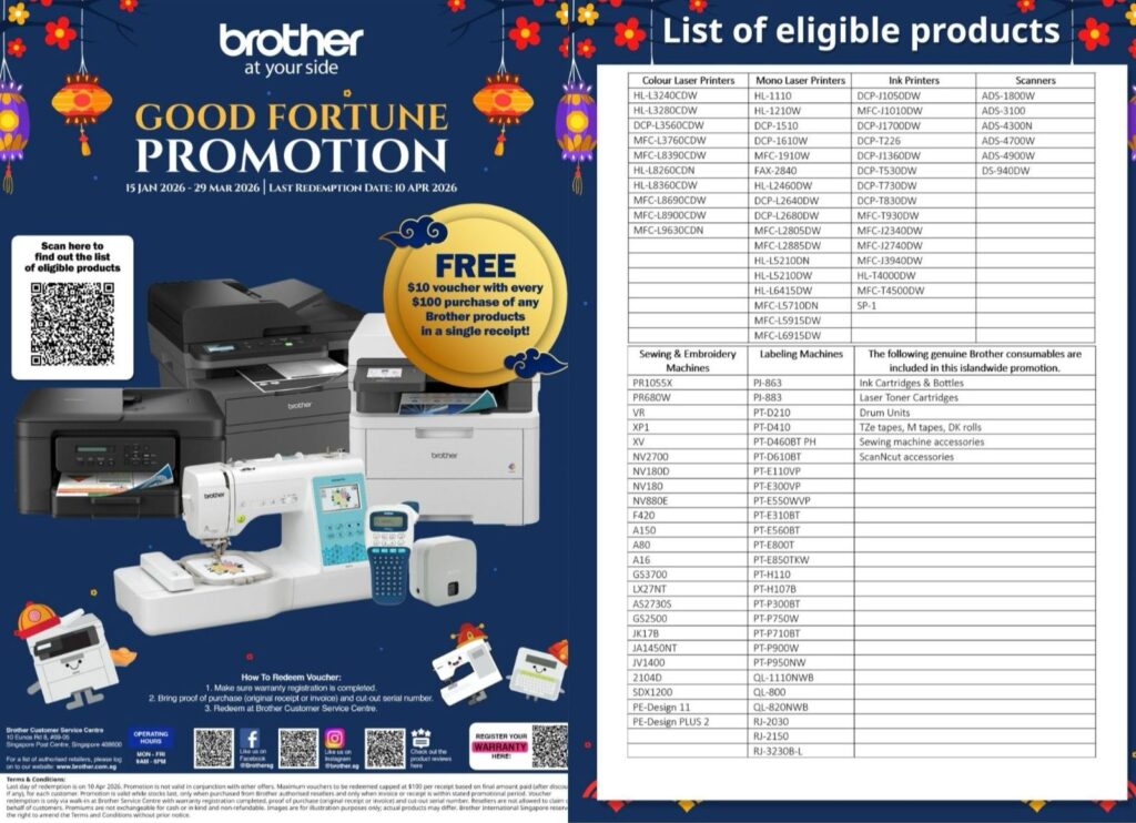 Free $10 NTUC voucher with every $100 Brother product purchased in a single receipt, capped at $100 vouchers per redemption for each customer.