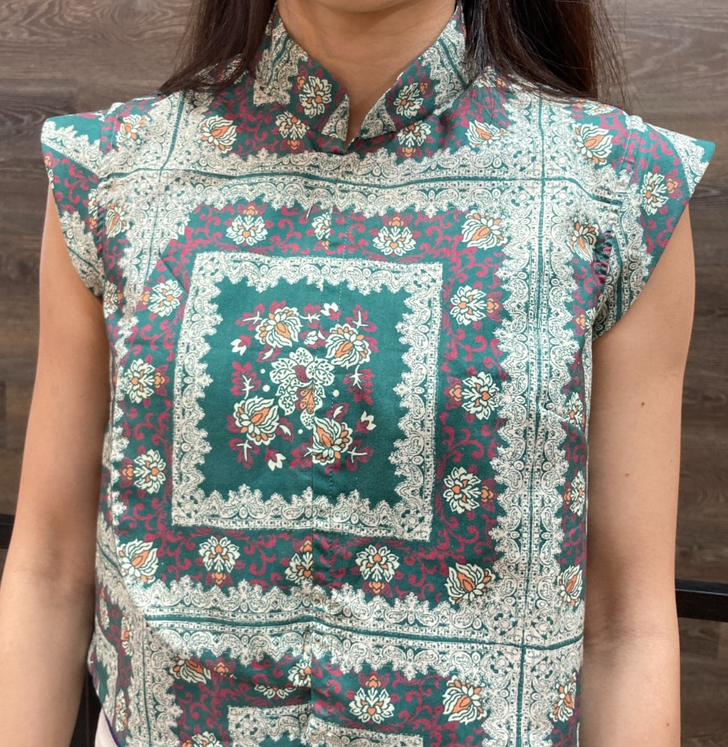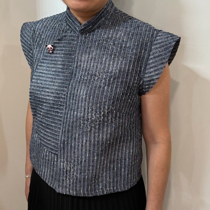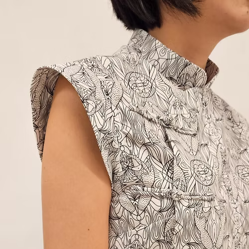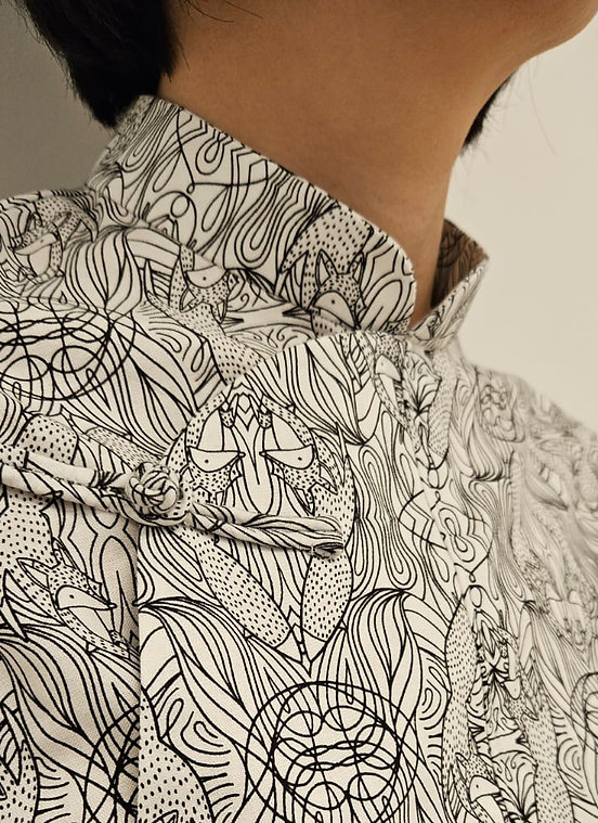 A modern twist on the classic samfu top. Featuring the iconic stand collar and frog buttons, its overlapped front opening adds both style and ease of wear. Designed with flattering darts and elegant sleeve flounces, this blouse complements all body shapes. Perfect for the Lunar New Year and versatile enough for any occasion—simply style it your way!